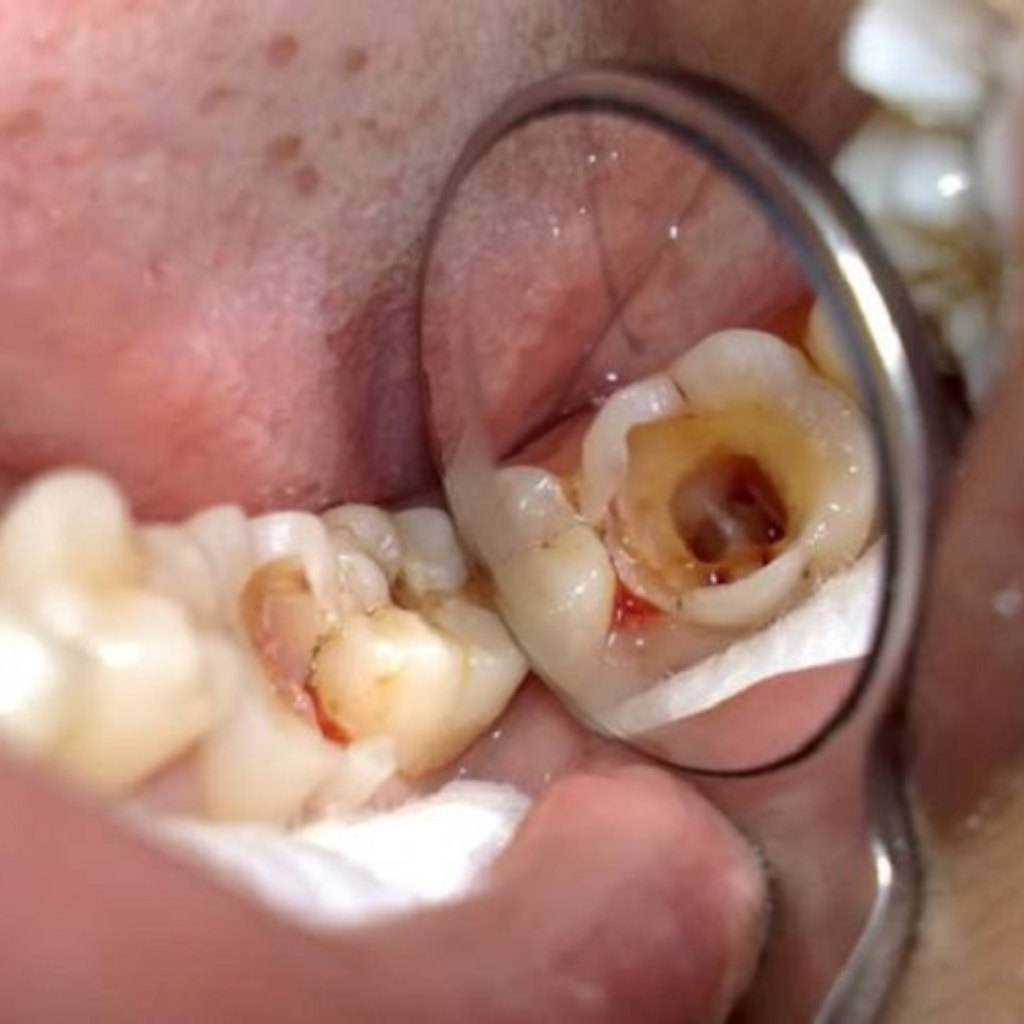 - Bề mặt răng xuất hiện các lỗ nhỏ li ti, lỗ tuỷ bị hở, có đốm màu vàng.